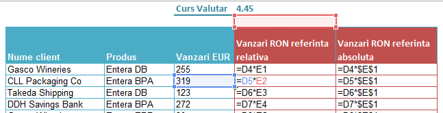 În acest exemplu, vom folosi un tabel în care avem următoarele coloane: Nume client, Produs, Vânzări EUR, Vânzări RON. În cadrul acestui tabel, dorim să calculăm vânzările în RON, pe baza cursului valutar din celula E1.